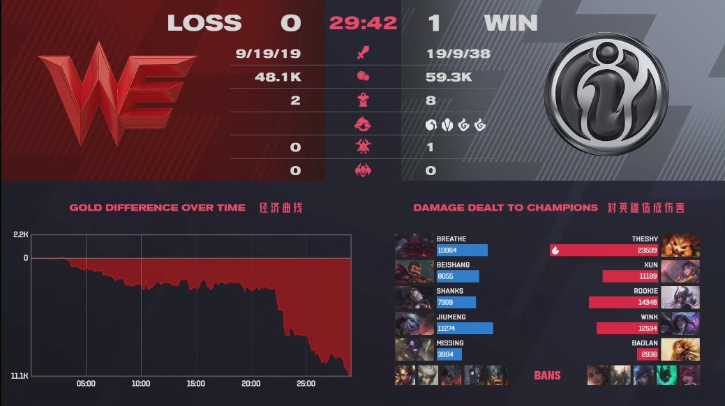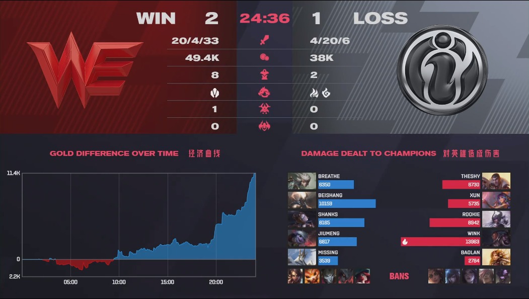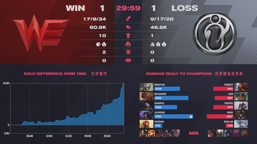 IG阵容:酒桶、奥拉夫、辛德拉、烬、加里奥。;WE阵容:青钢影、岩雀、发条、卡莎、蕾欧娜。如果说第一局是典型的IG顺风碾压局的话,那么第二局就是WE的复制局,从一级团开始就不断Gank,经济一路领先。特别是22分钟,Xun的奥拉夫被WE率先击杀后,WE顺势拿下大龙,并且在小龙坑处打出1换3的团战之后,WE就直接接管了比赛。尽管IG一直希望打出奇迹团,可惜反而在第28分钟,被WE打出了零换四的完美团。WE扳回一城。