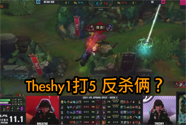 第一局比赛,典型的IG顺风局,Theshy下路一打五,还反杀两个。