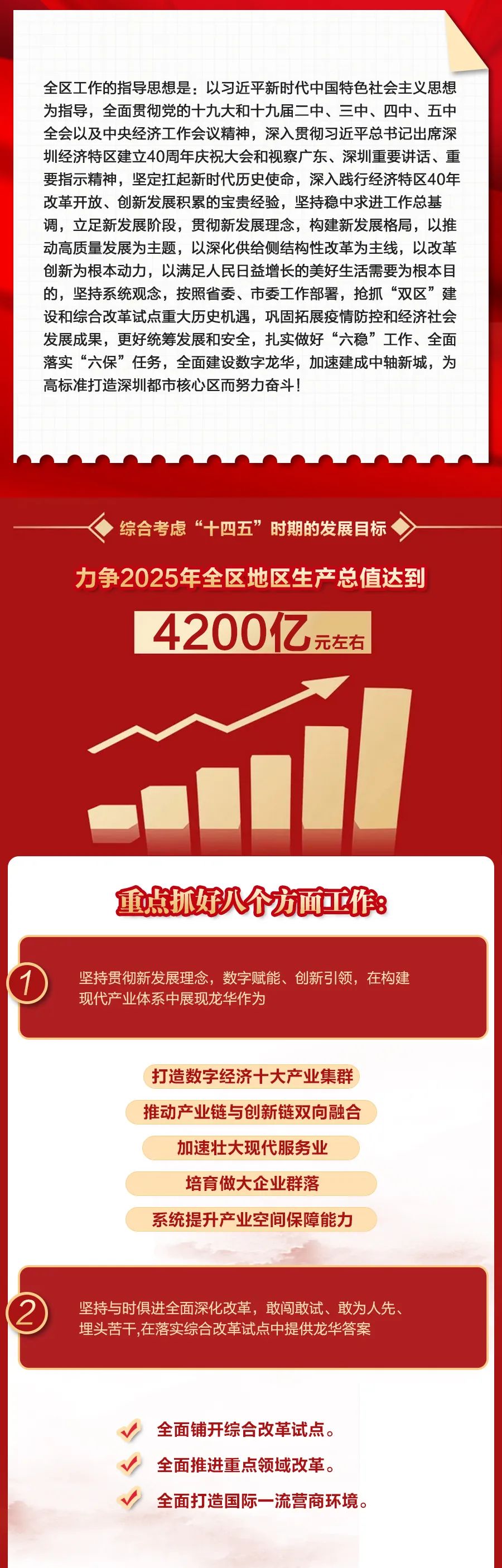 以习近平新时代中国特色社会主义思想为指导,全面贯彻党的十九大和十九届二中、三中、四中、五中全会以及中央经济工作会议精神,全面贯彻习近平总书记出席深圳经济特区建立40周年庆祝大会和视察广东、深圳重要讲话、重要指示精神,按照省委和市委决策部署,总结过去一年和“十三五”时期工作,谋划“十四五”时期发展蓝图和今年主要任务,团结带领全区人民牢记嘱托、感恩奋进,全面建设数字龙华,加速建成中轴新城,为高标准打造深圳都市核心区而努力奋斗,在率先实现社会主义现代化新征程中走在最前列!