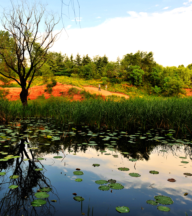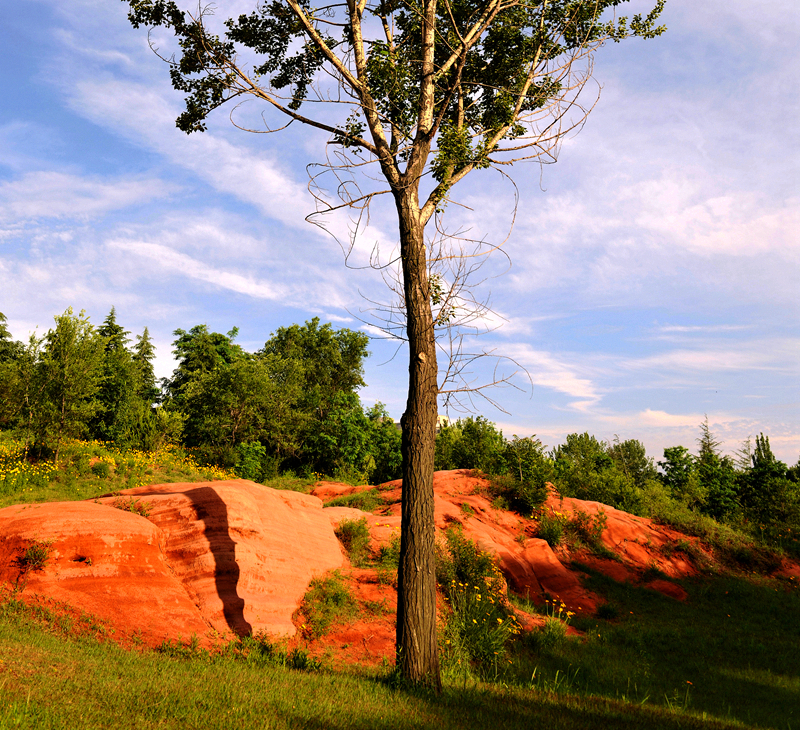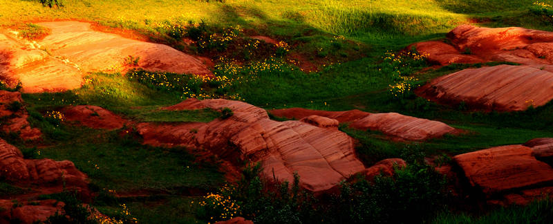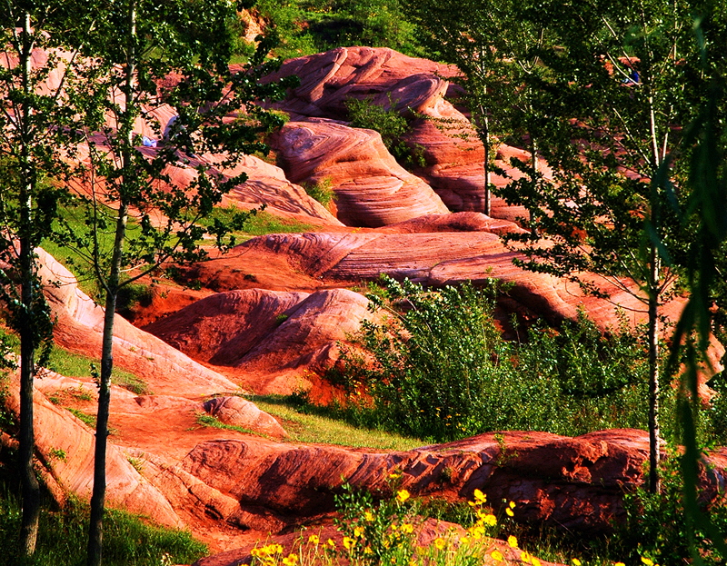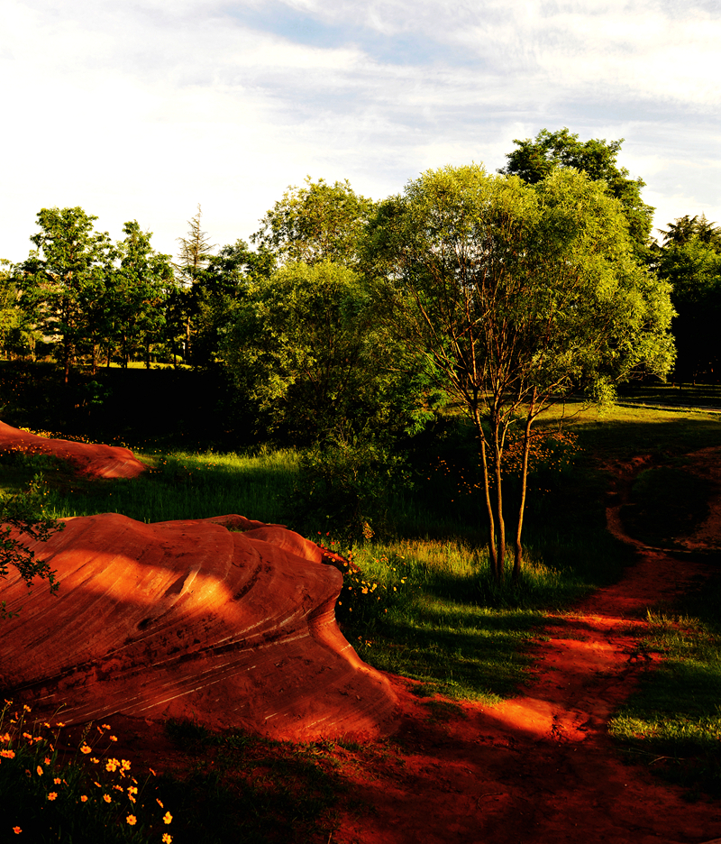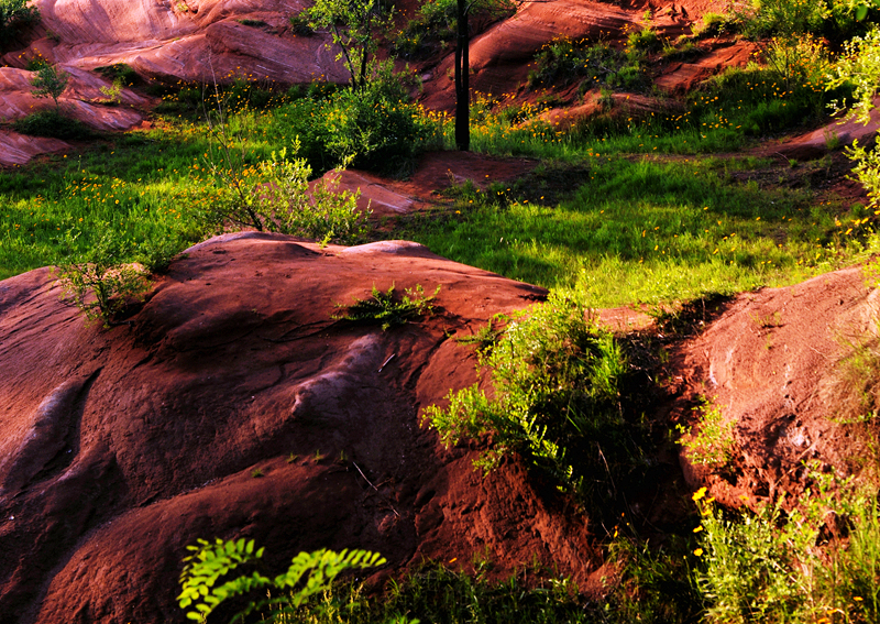 夕阳斜照半边昏,亿年红石更缤纷。大树登高把风临,浑身上下披满金。小花草丛把身隐,淡色清香醉人心。偶有蛙声耳边问,游客几人知古今?