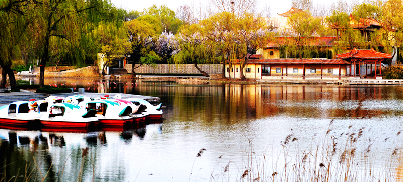 柳枝圆圆,石红灿灿。青草鲜鲜,水蓝潺潺。云白翩翩,人迹淡淡。风轻喃喃,景好叹叹。