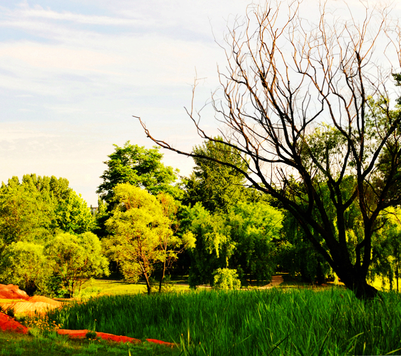 杨柳青青芦苇平,西边云浓东方明。老柳一棵当空横,岁到暮年仍从容。看日落日升。谁行?