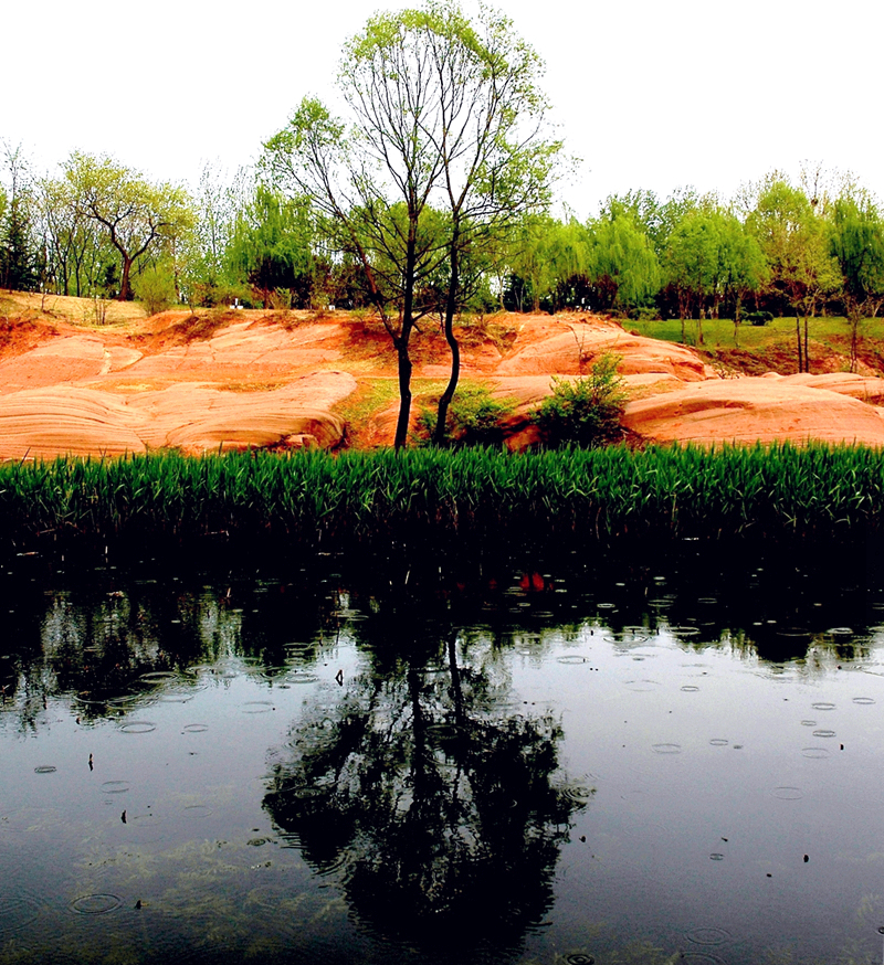 清雨不住,一弯水塘起浅雾。偶有蛙声出。红石展身躯,静静享受春浴。颜如玉。两柳似情侣,翠枝绿叶相拥诉。横生妙趣,馋煞红男绿女。