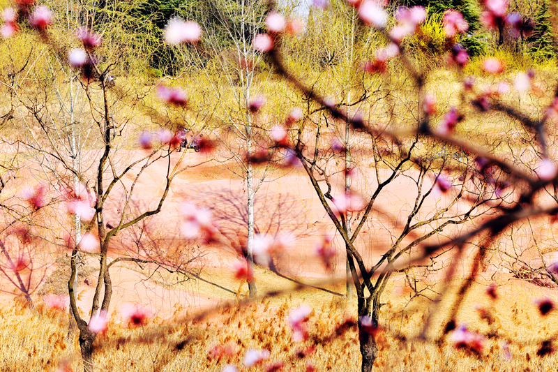 满树春花飞如烟,遮断望眼。使劲看,红石滚滚起波澜,层层向前,不见断。更有红男绿女翩翩,人乐语欢。偶闻流水潺潺,还有鸟声旋旋。一园春光烂漫。