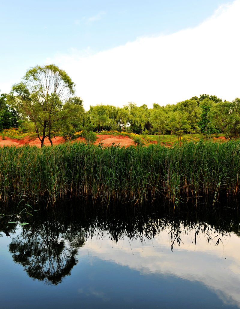 老柳枝残,入水影倩。好看。红石河畔,孩童闹玩。声欢。一片白云空中看,新荷布展,水美草鲜。壮观。