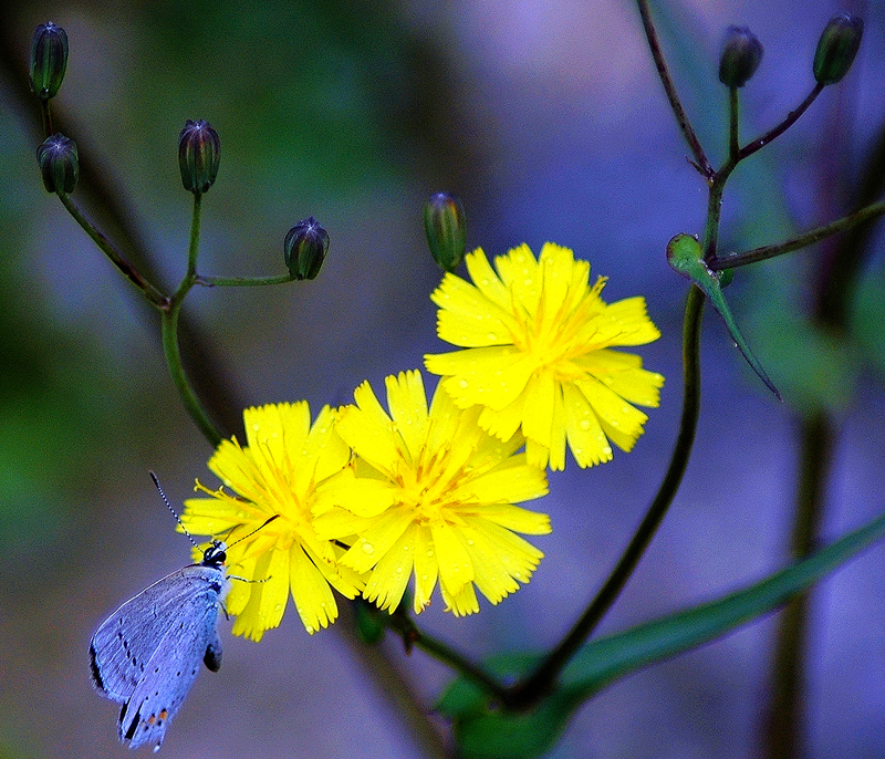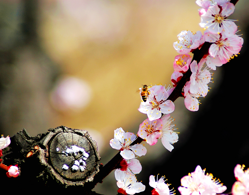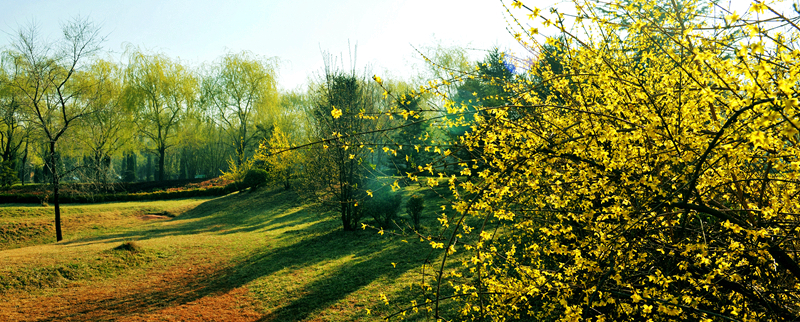 杨柳着新装,迎春花放。光影交错忙,有暗也有亮。坡上草劲长,疾风摇春光。花丛深处响,觅见蜂蝶藏。