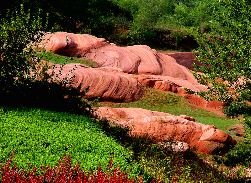 登高远眺红石谷,偶见好去处。石红如肌,石色如肤,越看越舒服。真想邀一知己,拿本书,坐在上面吸与呼,聊至无语。惜!她早已随风去。我给予,不是她的追逐。