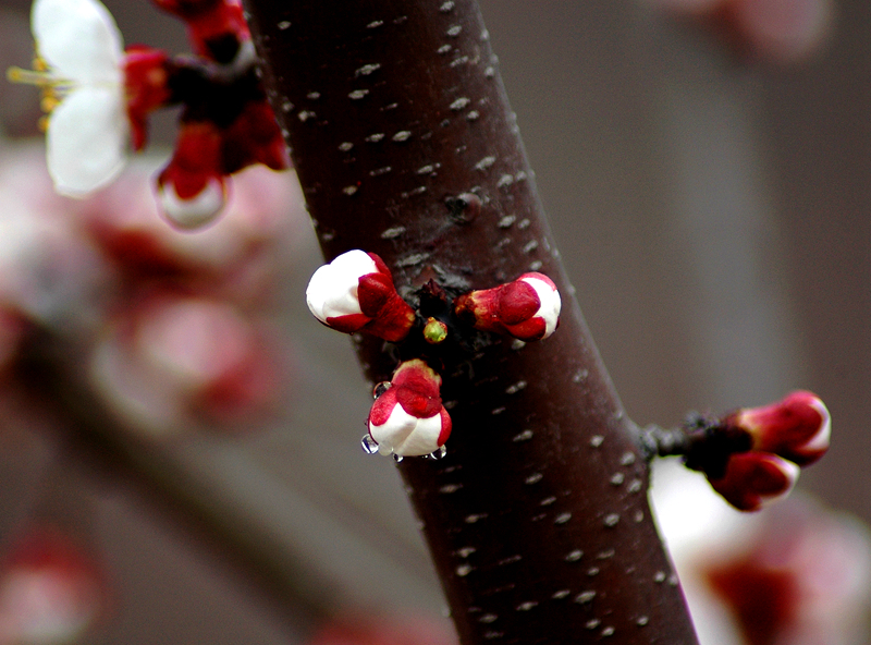 细风疏雨润新花,几粒琼珠身上趴。就是不滴答。身在低处无人夸,不怕。只愿果长大。待到香飘你我他,齐笑枝头傻。