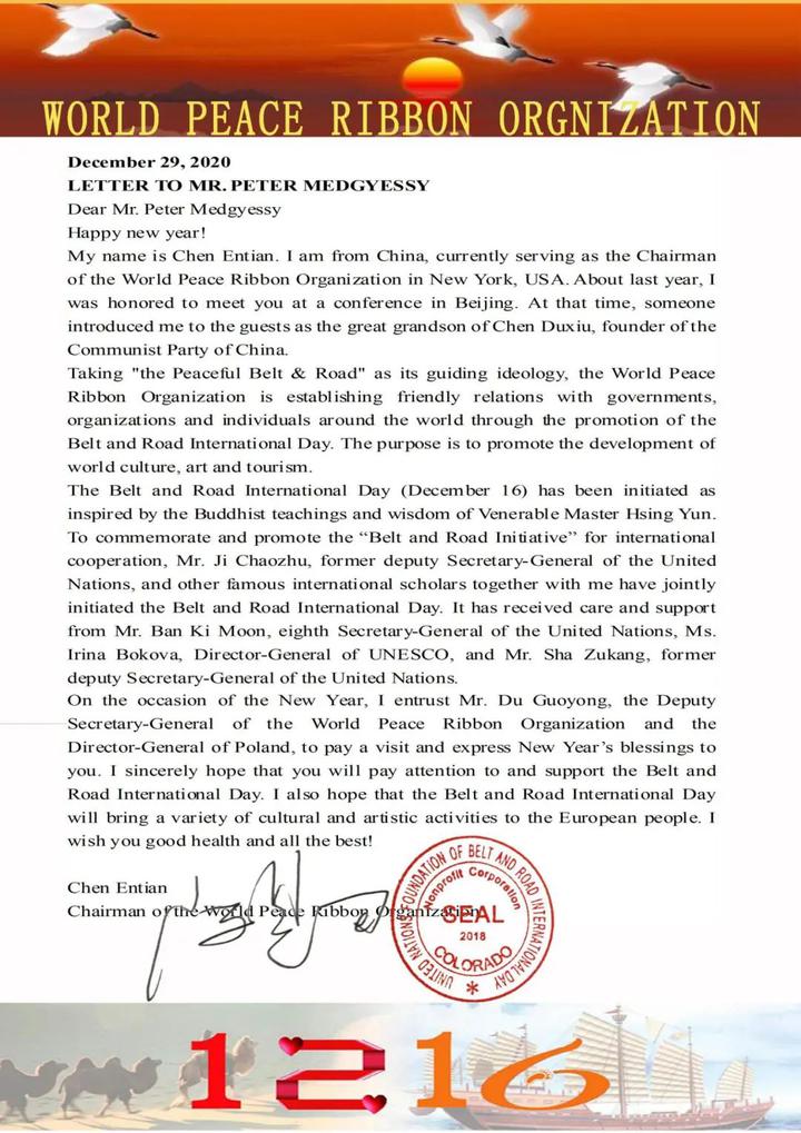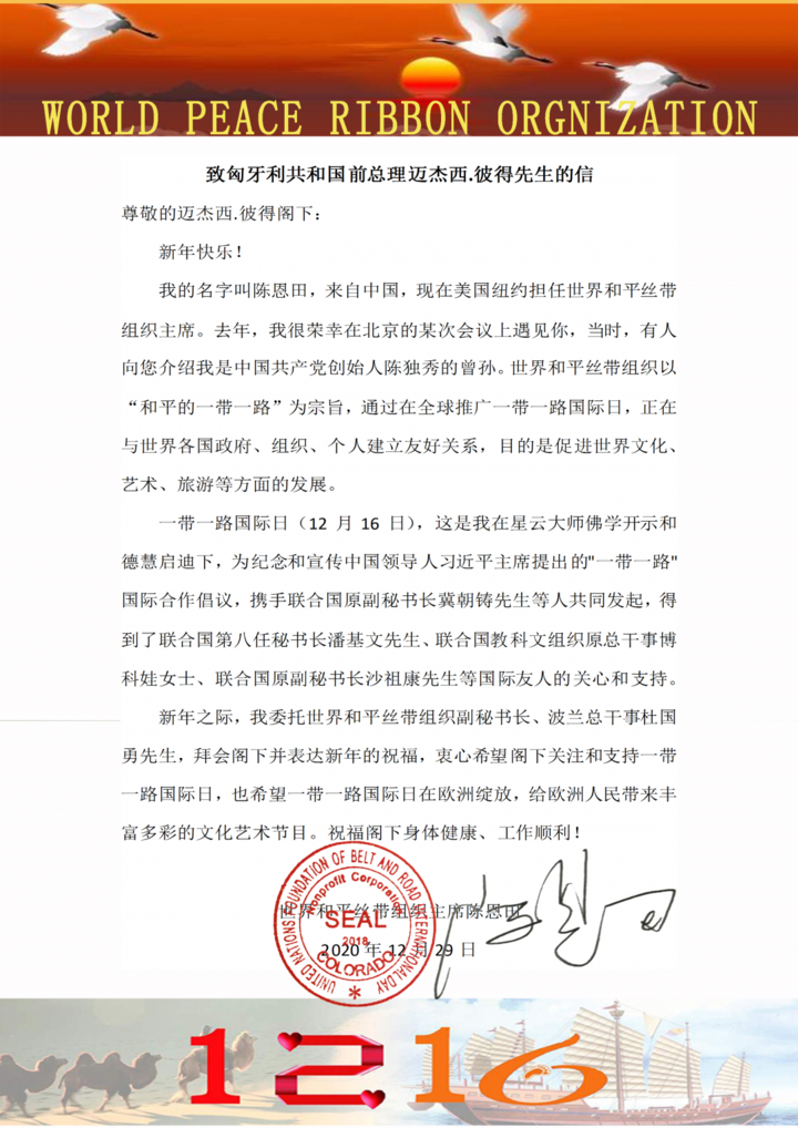 陈恩田致信给匈牙利前总理迈杰希的信中说,很荣幸在北京和您见面。【世界和平丝带组织】旨在促进一带一路和平,通过【一带一路国际日】的主题活动为纽带与世界各国政府、组织、个人建立友好关系,目的是促进世界文化、艺术、旅游等方面的发展。