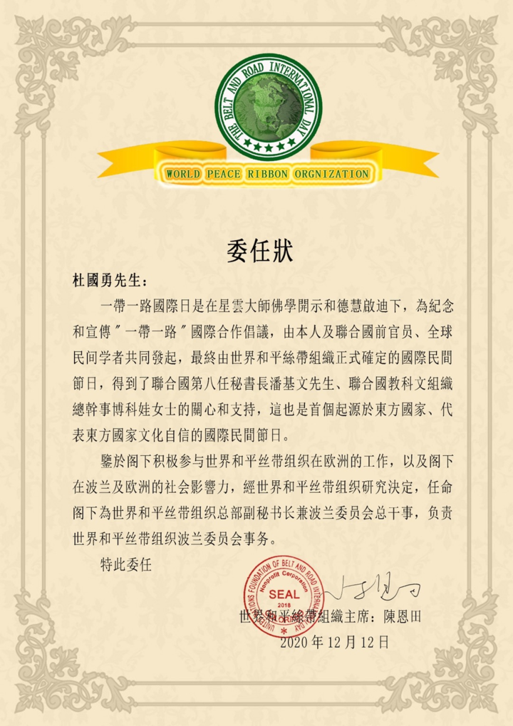 在此,世界和平丝带组织陈恩田主席特别感谢匈牙利中东欧中医药学会联合会主席于福年先生和波兰知名华侨杜国勇先生的支持,并任命杜国勇为“世界和平丝带组织总部副秘书长兼波兰委员会总干事”,负责波兰事务。
