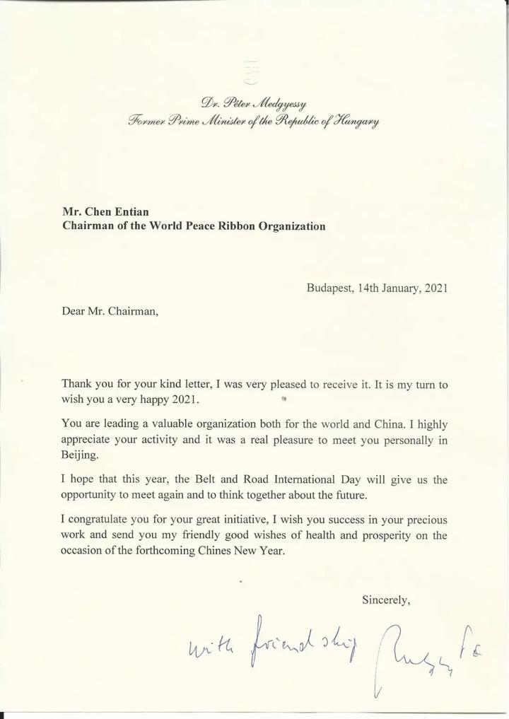 2021年伊始,匈牙利前总理迈杰希·彼得向世界和平丝带主席陈恩田发贺信恭祝2021年的到来并祝新年快乐。