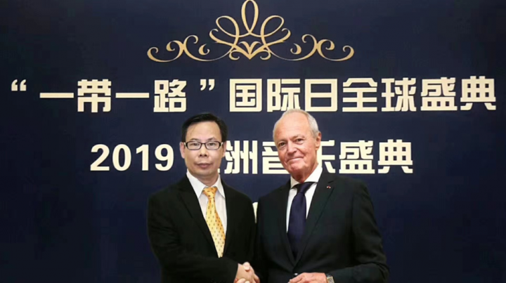 世界和平丝带主席陈恩田(左)与匈牙利前总理迈杰希·彼得(右)于2019年在北京举行一带一路国际日全球盛典暨亚洲音乐盛典启动仪式上的合影
