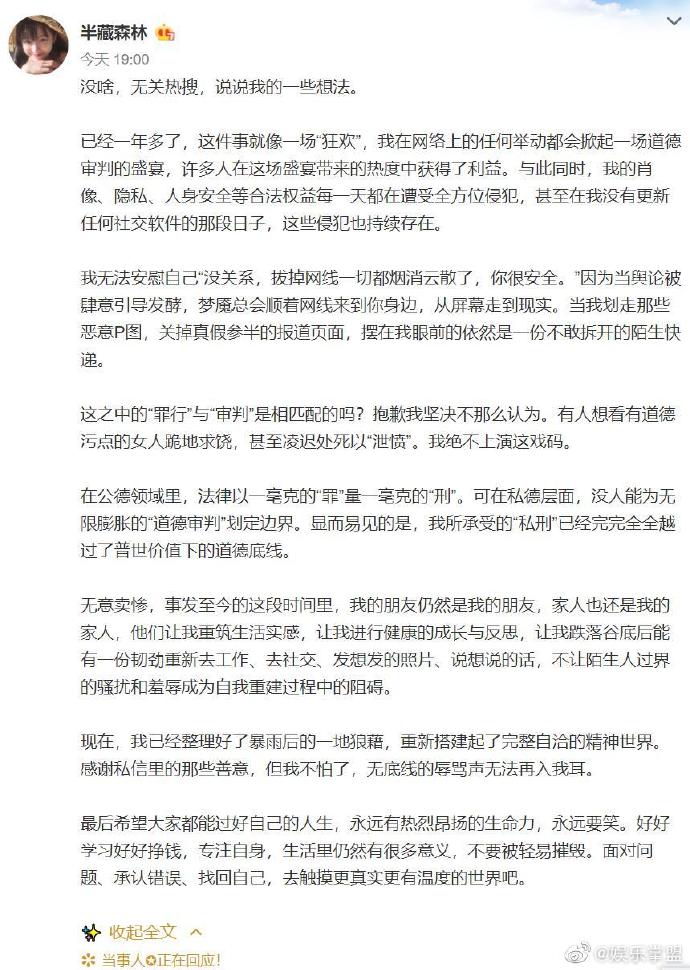 昨天晚上半藏森林还发长文,谈这段时间她遭受的网bao,还回应网友抵制她的事情。