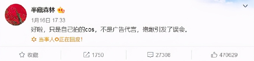 前不久在微博上发了组cos春丽的照片,被疑接代言,网友强烈抵制后,这才发了长文回应,并且迅速撤消了那组COS图。