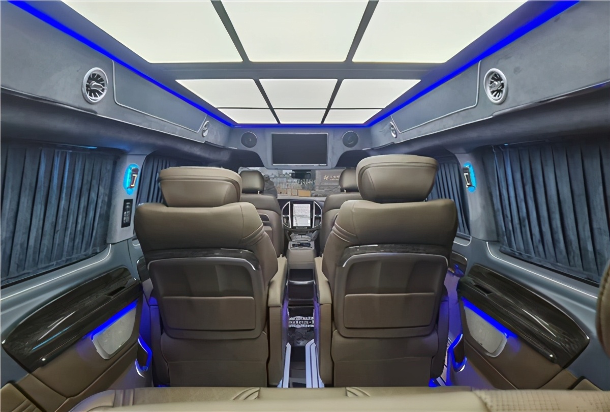 车身内壁采用进口麂皮绒和珍贵实木装饰面板包覆,豪华宫格顶灯带来奢华氛围;前后车舱采用了半灵活的多功能中隔断设计,固定的吧台加可升降的大尺寸电视,殿堂BOSE音响和蓝光DVD,满足一切娱乐生活需求。