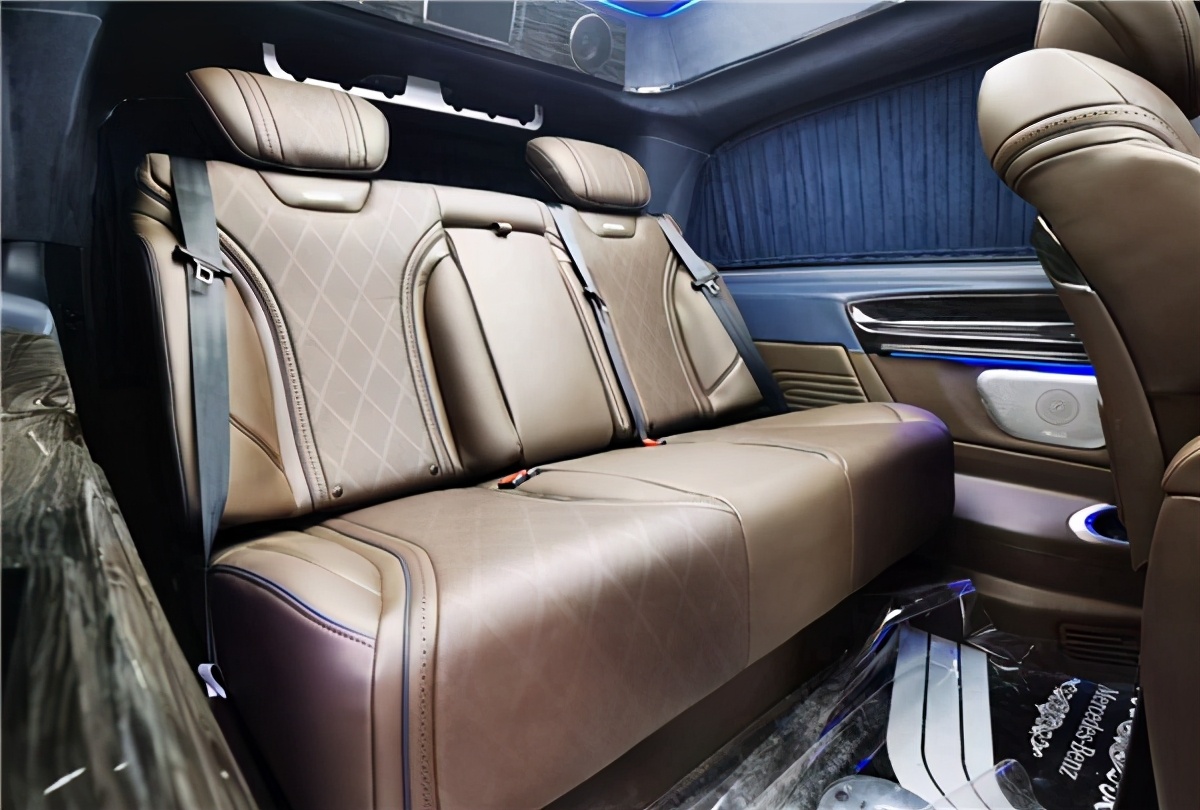 后三联排真皮座椅同样舒适、触感细腻,中间扶手处有杯托、储物格的设计,方便贴心。扶手收回,配备了抱枕,一副乖乖“优等生”的模样。奔驰威霆房车双色典雅款,不管是从外观、内饰,还是从配置方面来看,都是一位出行的好帮手。