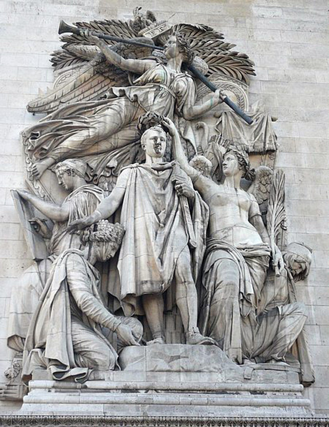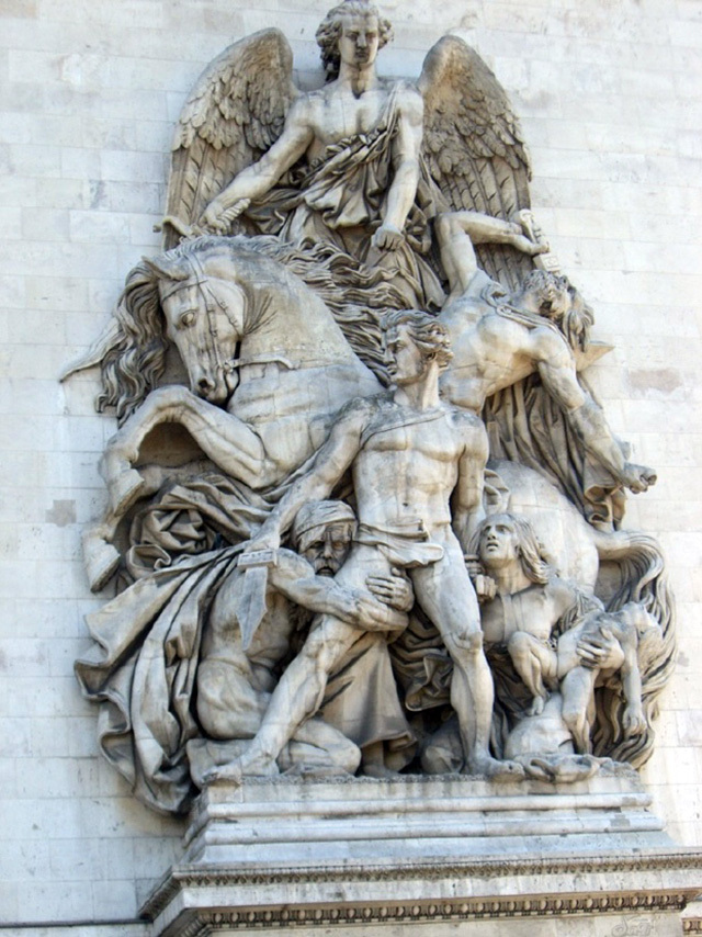 后来拿破仑为纪念他最得意的奥斯特里茨战役,在巴黎修建了凯旋门,凯旋门下有四组雕塑《马赛曲》(也叫《出征》)、《胜利》、《抵抗》、《和平》。我去欧洲旅游时,在凯旋门下仔细欣赏了这四组雕塑。