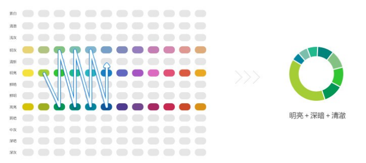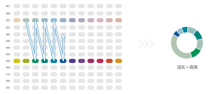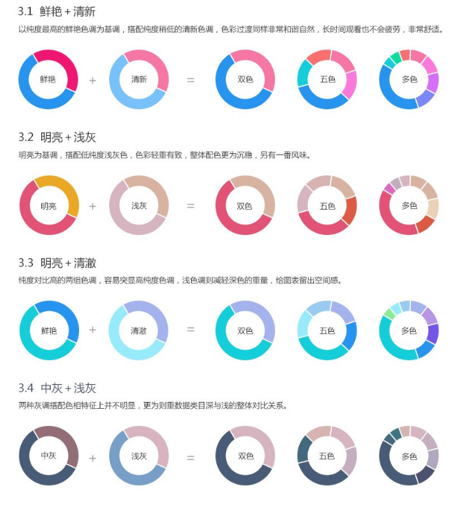 多组色调搭配在选色方面非常丰富,适合类目多的数据图表,一般情况下三组色调的色彩搭配足够表现图表数据了,多组色调搭配比较讲究色彩轻重比例,浅色调给图表留下呼吸的空间感,深色调点缀搭配突出重点,选择重量感相当的搭配。
