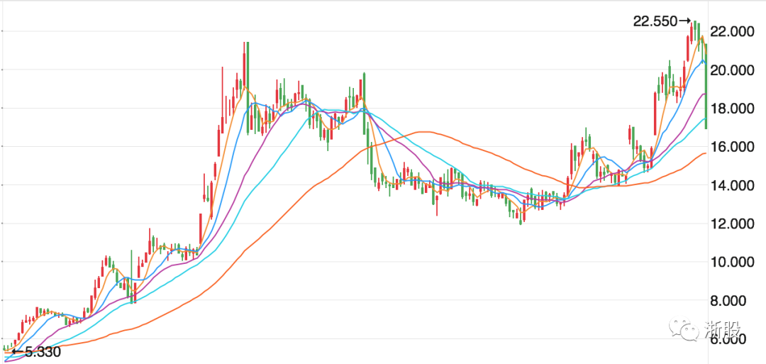 受天能股份上市预期带动,今年4月后,天能动力股价持续上涨,从5元附近最高涨到22.55元。