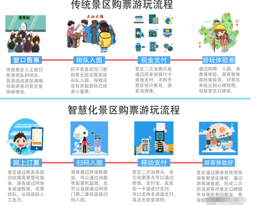进入景区,可以刷卡或手机进入公园,无需换票;进入景区后,可以随时打开手机听电子导游解说。可以随时租用景区内的自行车和游乐设施。随时随地都能找到自己想玩的地方。在景区看到合适的文化创意产品也可以通过智能支付;旅游结束后,移动终端可以支付停车费,车辆可以自动进出停车场,一键生成游记,分享所有的旅行体验。