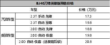 近日, 北京BJ40 刀锋英雄版开启了预售,预售价17.3-20.8万元,共推出5款车型。