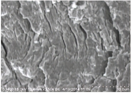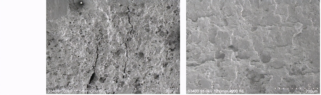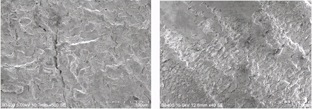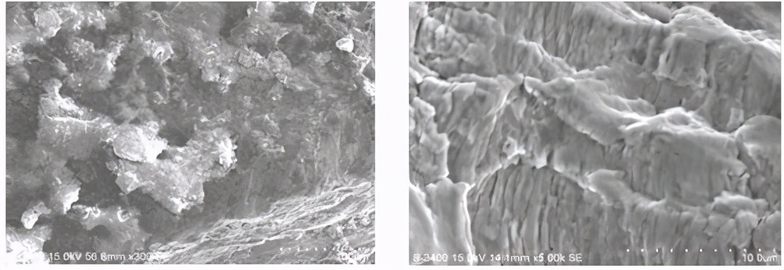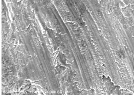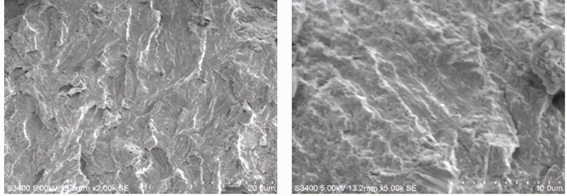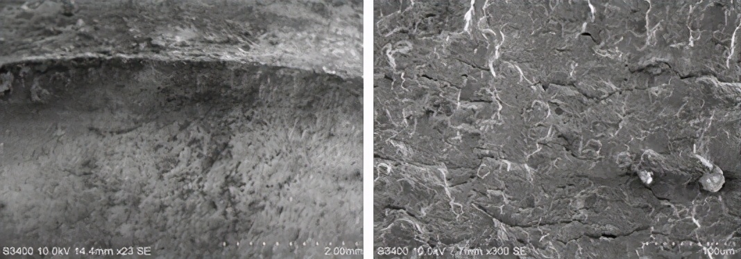 宏观低倍疲劳弧线,扩展区可见明显的连续平行的疲劳条带、二次裂纹,螺栓断裂性质为疲劳断裂。断口扫描电镜形貌见图9-17、图9-18和图9-19。