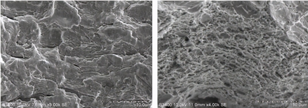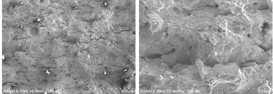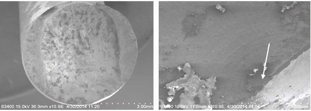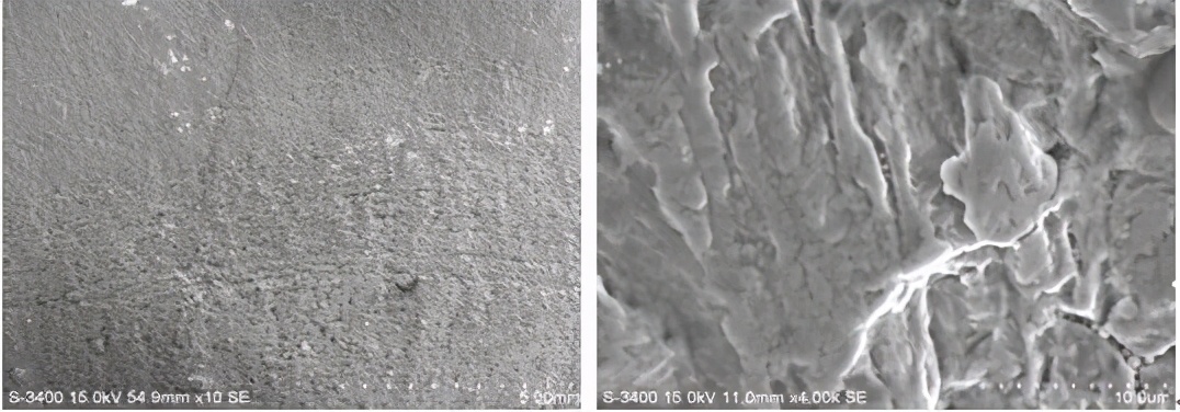 双头螺柱在安装运行一段时间后断裂,断面可见大量细密疲劳条带,条带细密,瞬断区呈撕裂韧窝,其中可见较多夹杂物颗粒和显微空洞,疲劳裂纹扩展充分,断口形貌见图9-12、图9-13和图9-14。