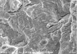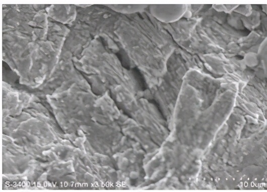 螺栓安装使用一段时间后在头杆部结合部断裂,断口无明显宏观塑性变形,有明显的疲劳源区、疲劳扩展区和最终断裂区。疲劳扩展区有明显的疲劳条带和二次裂纹,说明在交变载荷作用下裂纹不断扩展最终导致疲劳断裂。疲劳断口电镜形貌见图9-8、图9-9、图9-10和图9-11。