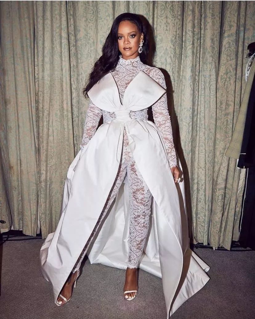18年的主题是“宗教”,蕾哈娜就是一身教皇的打扮来自于Martin Margiela bustier(马丁·马吉拉·巴斯提尔)的白色套装,反正在气势上没有输。