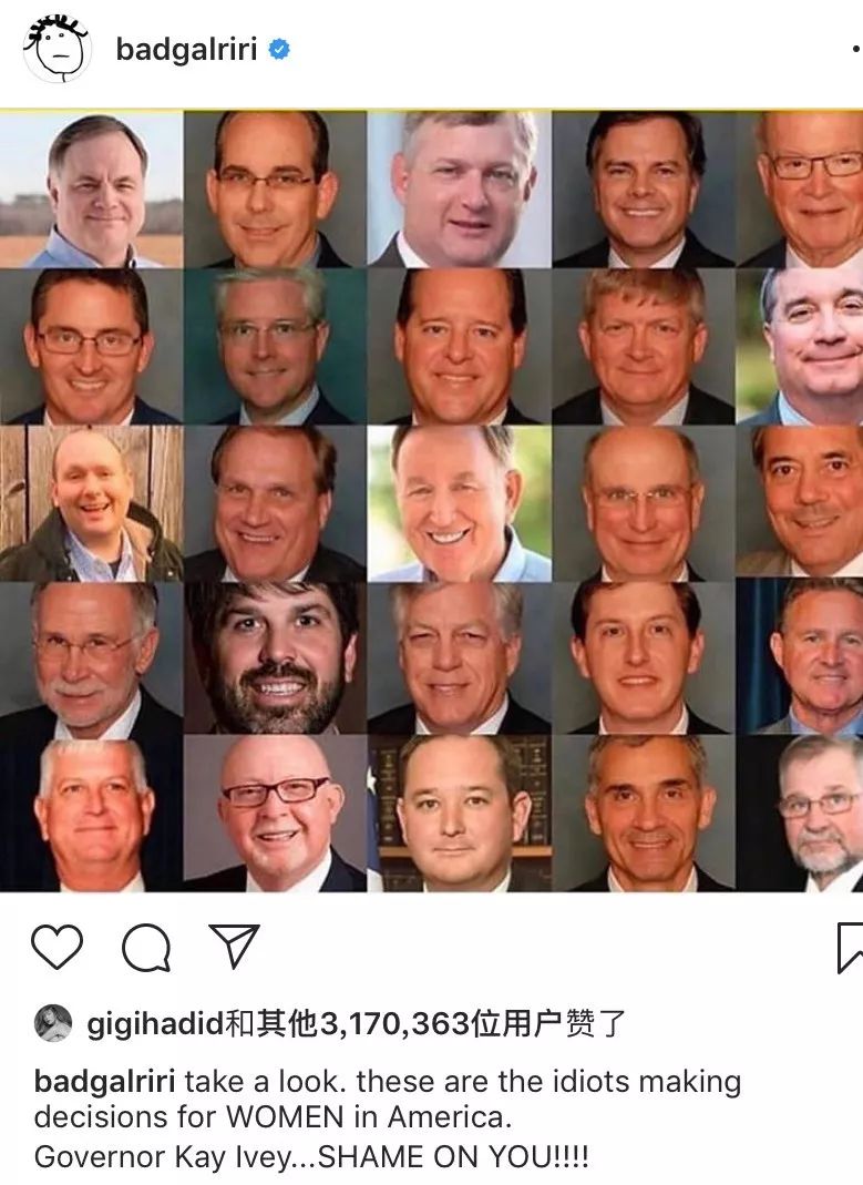 蕾哈娜的Insgram账户名字badgalriri(“坏女孩日日”),实名制谴责支持反堕胎法的议员。