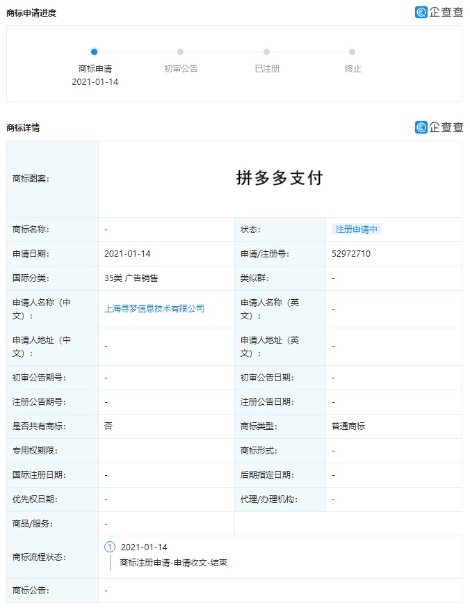 IT之家 1 月 19 日消息 企查查 App 显示,1 月 14 日,拼多多经营主体上海寻梦信息技术有限公司新增一项 “拼多多支付”商标申请信息,国际分类涉及广告销售,商标状态为 “注册申请中”。