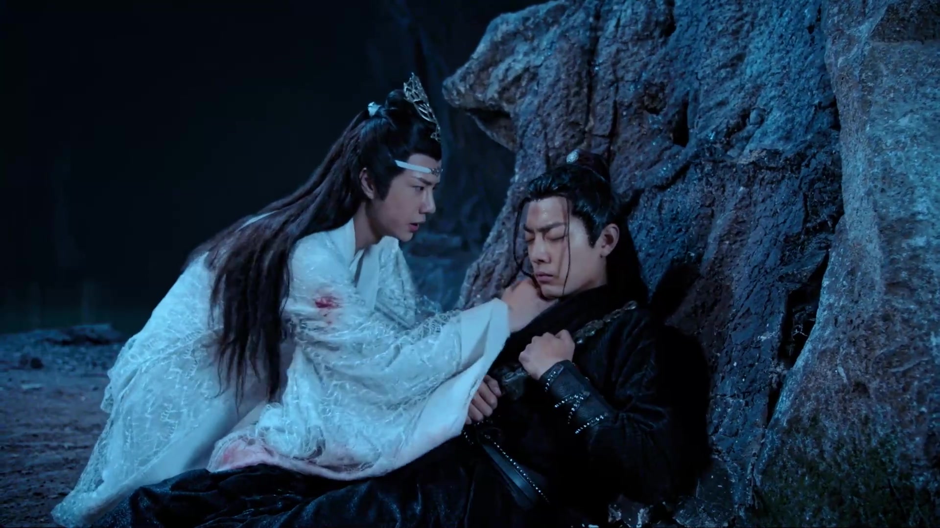 魏无羡走入龟壳里,发现里面肮脏不堪,臭气熏天,他庆幸是自己进来,不然蓝忘机会受不了。魏无羡遭遇危险,一向波澜不惊的蓝忘机脸上第一次露出焦灼、担忧、害怕的表情,他把绳索拉得更紧,双手出血都浑然不觉。终于,他们合力解决了妖兽,但魏无羡被阴铁剑影响,还受伤不轻,胸口的伤也感染了。他发起了高烧,神志开始模糊起来。蓝忘机担心极了,把自己所剩无几的灵力毫不犹豫地输送给魏无羡。