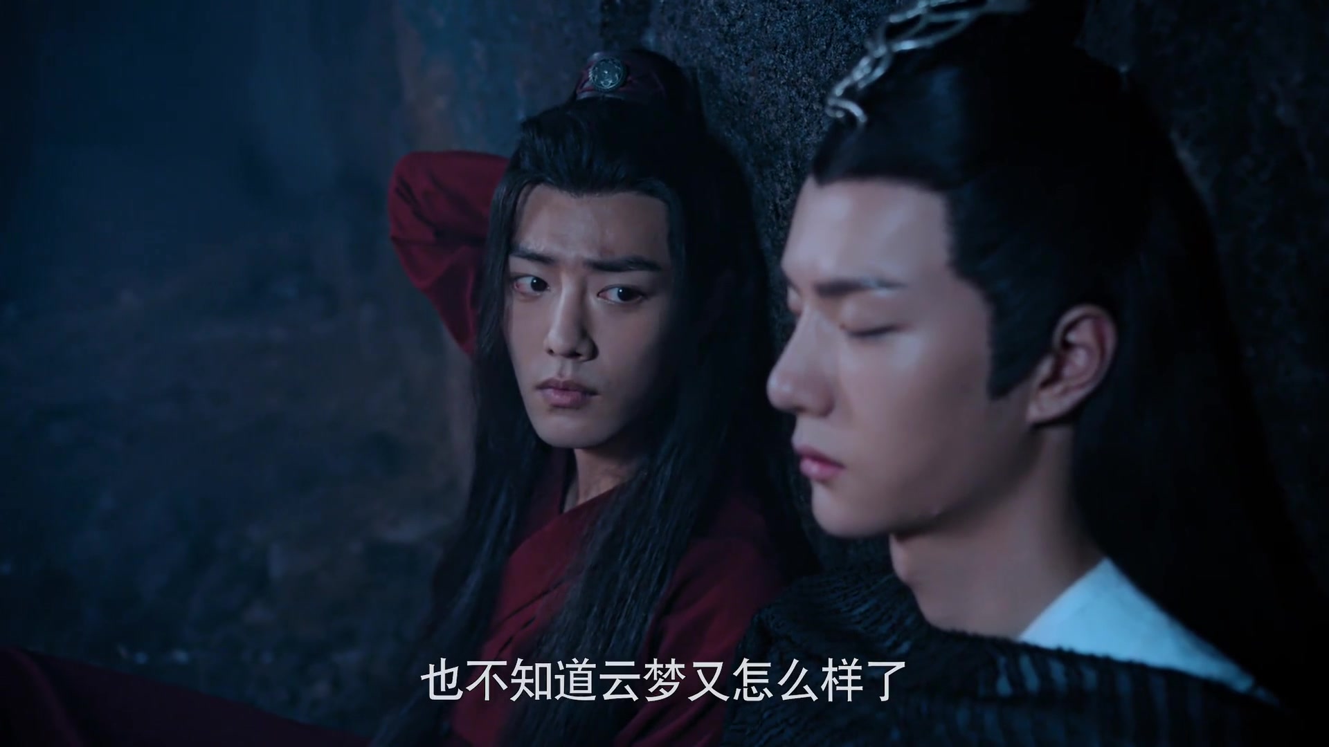 魏无羡要把烤好的衣服给蓝忘机披上,转头发现蓝忘机已经睡着了,轻轻地为他盖上外衣。魏无羡的眼神充满了怜惜,挨着蓝忘机坐下,心中百感交集,你遭受那么多痛苦,我都没有办法替你分担,我真没用!现在披上我的外衣,有没有觉得暖和些?有我陪着你照顾你,会不会安慰些?此时此刻,我反而觉得很温馨,教化司我们都没机会说话,问你什么你也故作坚强不肯多说,此时你第一次和我说了这么多话,我真高兴。平时我不敢盯着你看,怕你说我无聊,你沉沉睡去后我能好好看看你,你清冷的面容透出几分脆弱,线条也柔和了很多,也许这才是一个真实的你,是不是只有面对我才能卸下心防?是不是因为我在你心里很特别?可怜的少年,快点好起来吧……