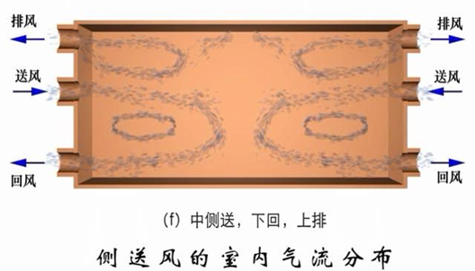 侧送风口布置在房间的侧墙上部,空气横向送出,气流基本吹到对面墙上后转折下落,以较低速度流过工作区,再由布置在侧墙下部的回风口排出。根据房间跨度大小,可以布置成单侧送、单侧回,和双侧送、双侧回。