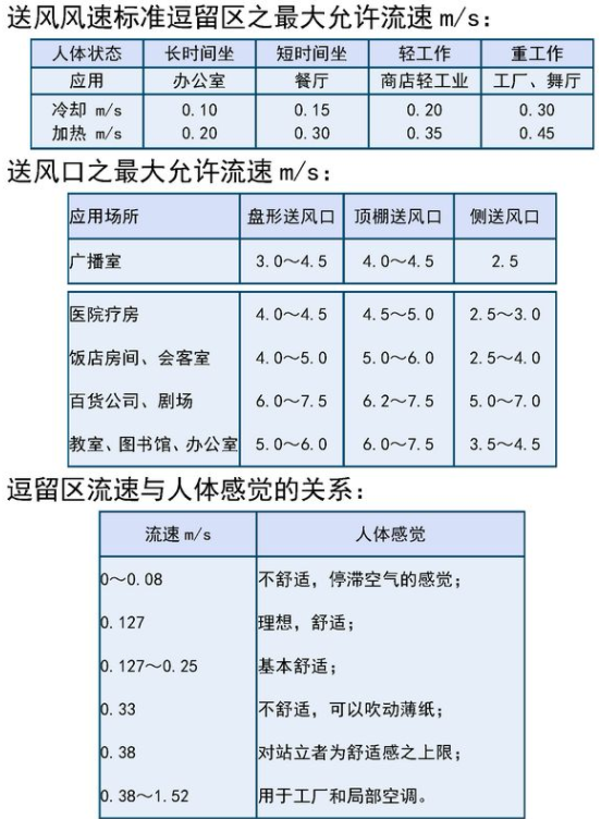 对于工作区的温湿度、清洁度的要求,一般依据舒适性空调或工艺性空调提出的参数确定。对于工作区的流速可参考:舒适性空气调节室内冬季风速不应大于0.2m/s;夏季不大于0.3m/s,工艺性空气调节工作区风速宜采用0.2~0.5m/s。