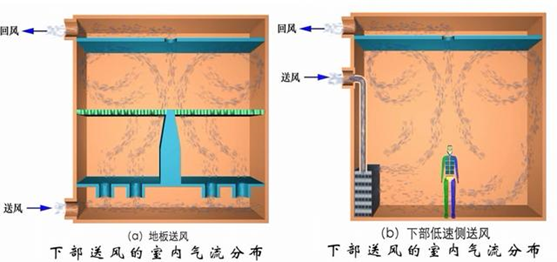 送入室内的空气先在地板上均匀分布,然后被热源(人员、设备等)加热的空气以热烟羽的形式形成向上的气流,将余热和污染物排出人员活动区。