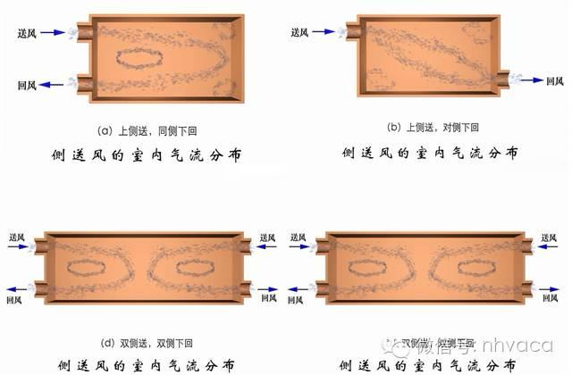 按照送、回风口布置位置和型式的不同:侧送侧回、上送下回、中送上下回、下送上回、上送上回。