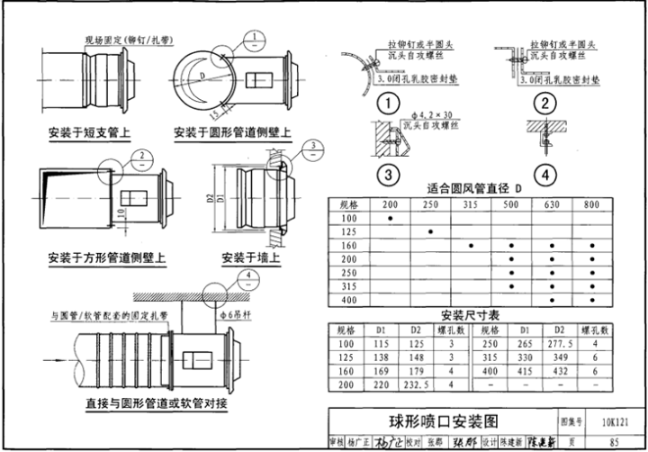 3.2球形喷口的常用安装方式为:①矩形风管上安装;②圆形风管上安装;③对接圆形风管或软风管安装;④侧墙静压箱安装。