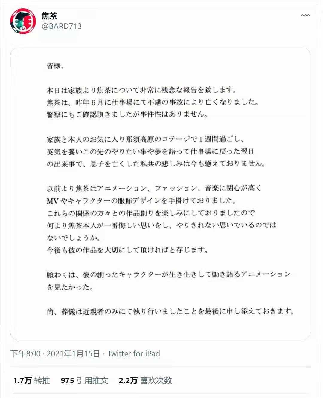 讣告中说到,焦茶是在工作中遇到意外事故而去世的。昨天还在最喜欢的小屋跟家人们开心地谈论起以后想做的事,自己的梦想,