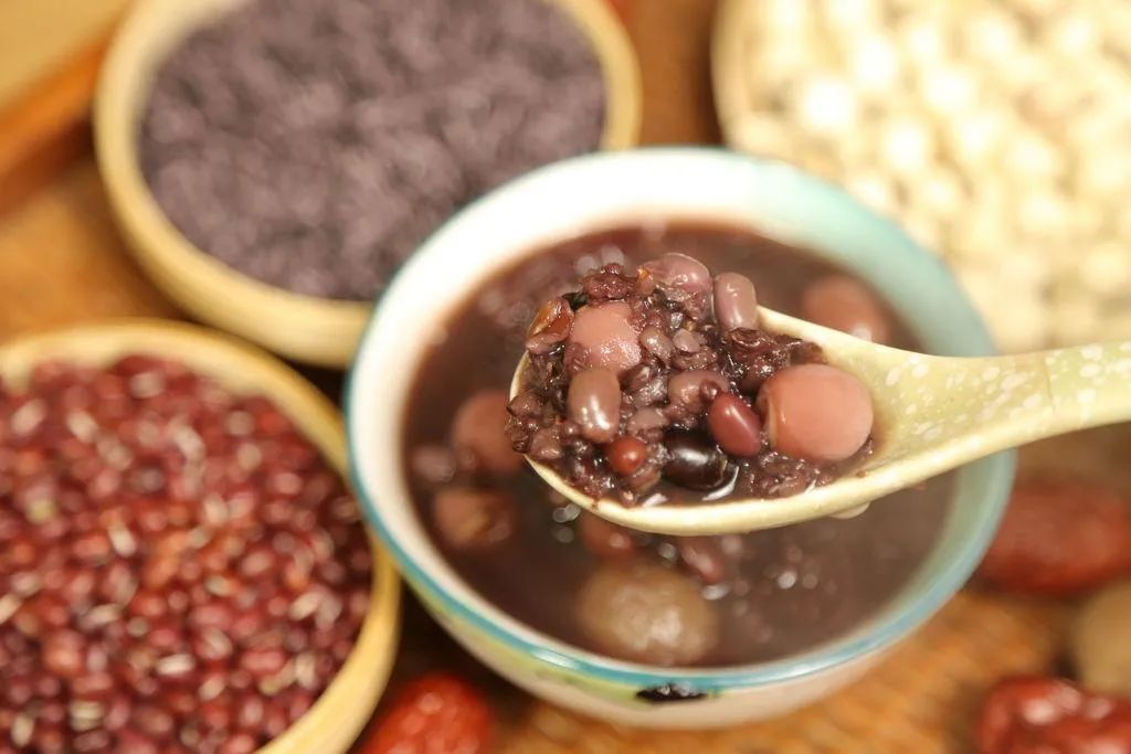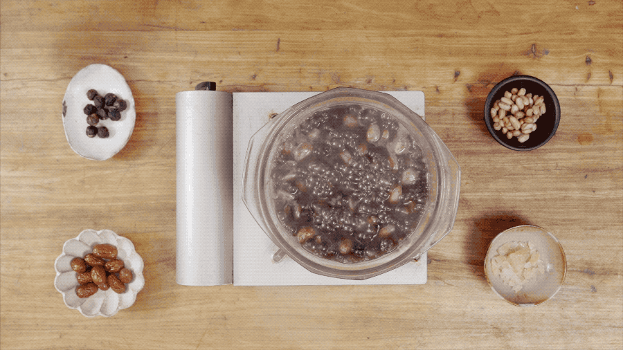 每个地方的八种料都略有不同,台台则用了传统中略有新意的红豆、绿豆、薏米、芸豆、莲子、黑米、糯米等主料和莲子、花生、桂圆肉做辅助配料,甜甜糯糯,下肚那一刻就是满足!