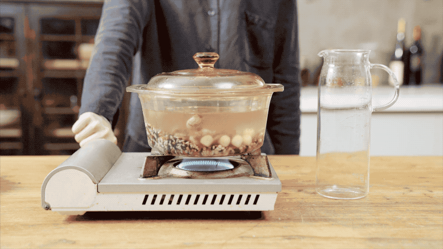 泡好的豆子放入锅中,倒入1500ml水,大火煮沸,盖上盖子,小火煮20分钟。