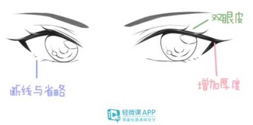 为了显得眼睛更加好看,一般我们都会画成双眼皮。眼睛更加强调外眼角,模糊内眼角,睫毛数量相对减少,反而变得强调粗细。眼睛是一个非常强调角色个性的地方,画法也非常之多,不要一个模式走到低,得多变通。