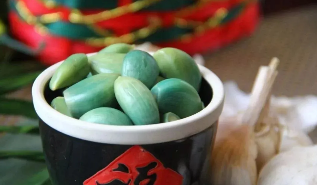 在中国的北方有一个习俗,在腊八节的时候把蒜泡到醋中,经过醋的浸泡后,蒜会变的通体碧绿。经过醋泡过的蒜和饺子一起吃更配哦~在中国“蒜”和“算”同音,随着年底的临近,在腊八节那天吃蒜是计算整年收支的象征。
