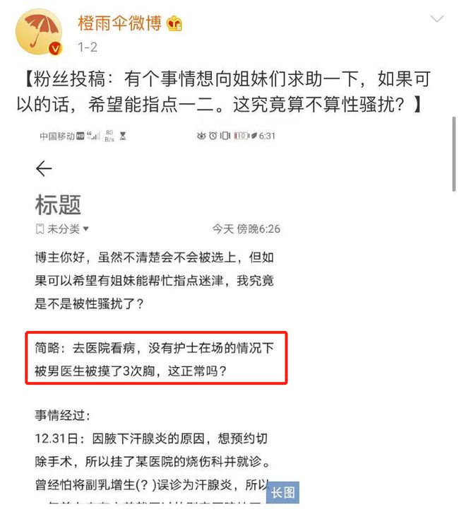 不久前橙雨伞微博也曾收到读者投稿,该读者怀疑自己被医生性骚扰,但又怀疑是否是自己太过敏感。