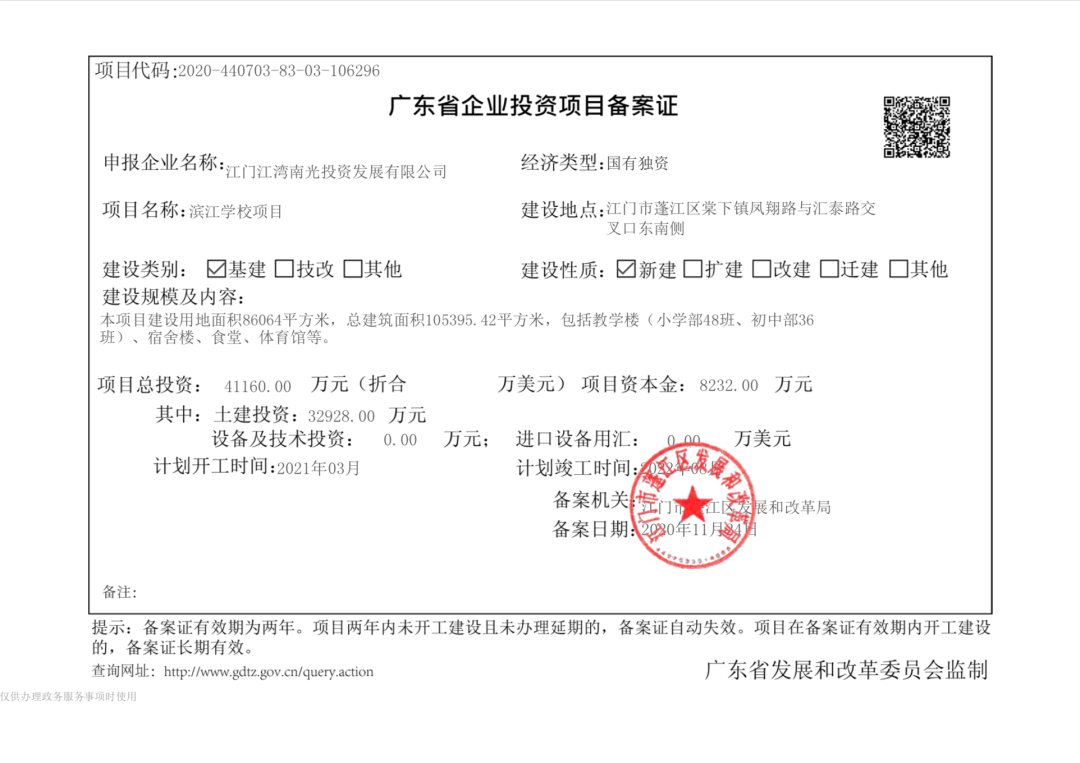 根据出让条件显示,竞得人竞得土地后,必须在2年内将地块开发建成广东省教育厅直接管理的省级重点中学的附属江门学校小学部。