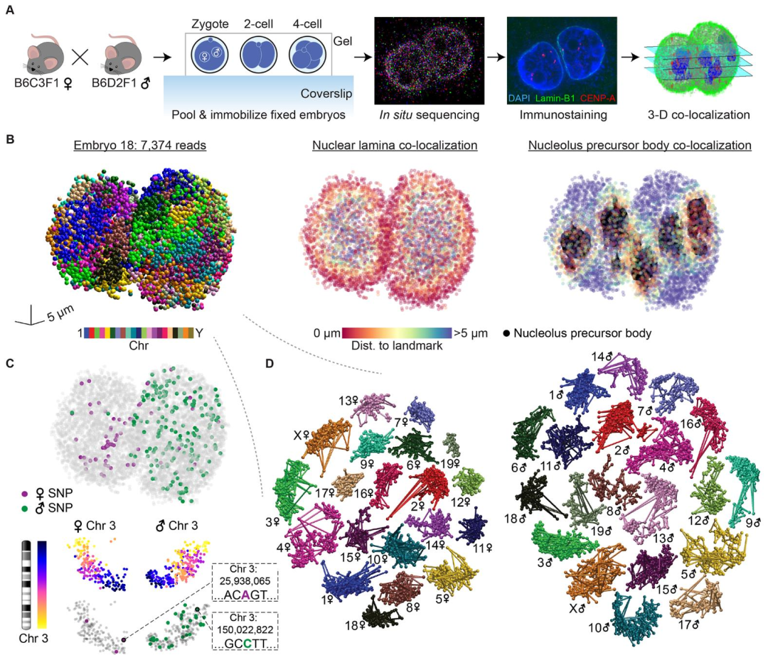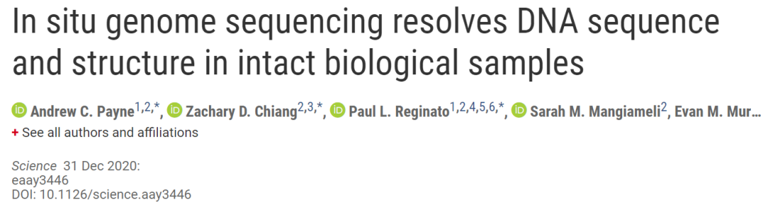 近日,哈佛大学、Broad研究所及MIT联合团队开发了原位基因组测序技术(in situ genome sequencing, IGS),实现了完整生物样品中DNA序列和结构的同时解析;之后将IGS技术应用于人类成纤维细胞和早期小鼠胚胎,在单个细胞核中对数千个基因组位点进行了空间定位,揭示了受精卵中的单细胞染色质结构域及单个胚胎中整体染色体定位的表观遗传记忆。该项工作以“In situ genome sequencing resolves DNA sequence and structure in intact biological samples”为题发表在Science上。