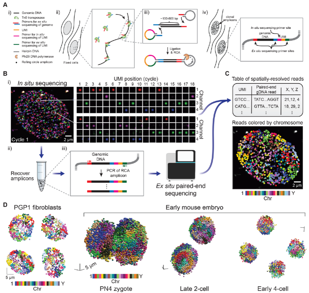 然而,这些方法不能联合应用于同一细胞,并且缺少在单个细胞中同时对基因组进行测序和成像的方法。目前已有一些突破性研究将Hi-C与显微镜相结合或基于单核苷酸多态性(SNP)特异性探针进行FISH检测,但其在成像或测序通量上仍然受到限制。因此,在单个细胞中同时实现基因组分析和空间分析的问题一直悬而未决。