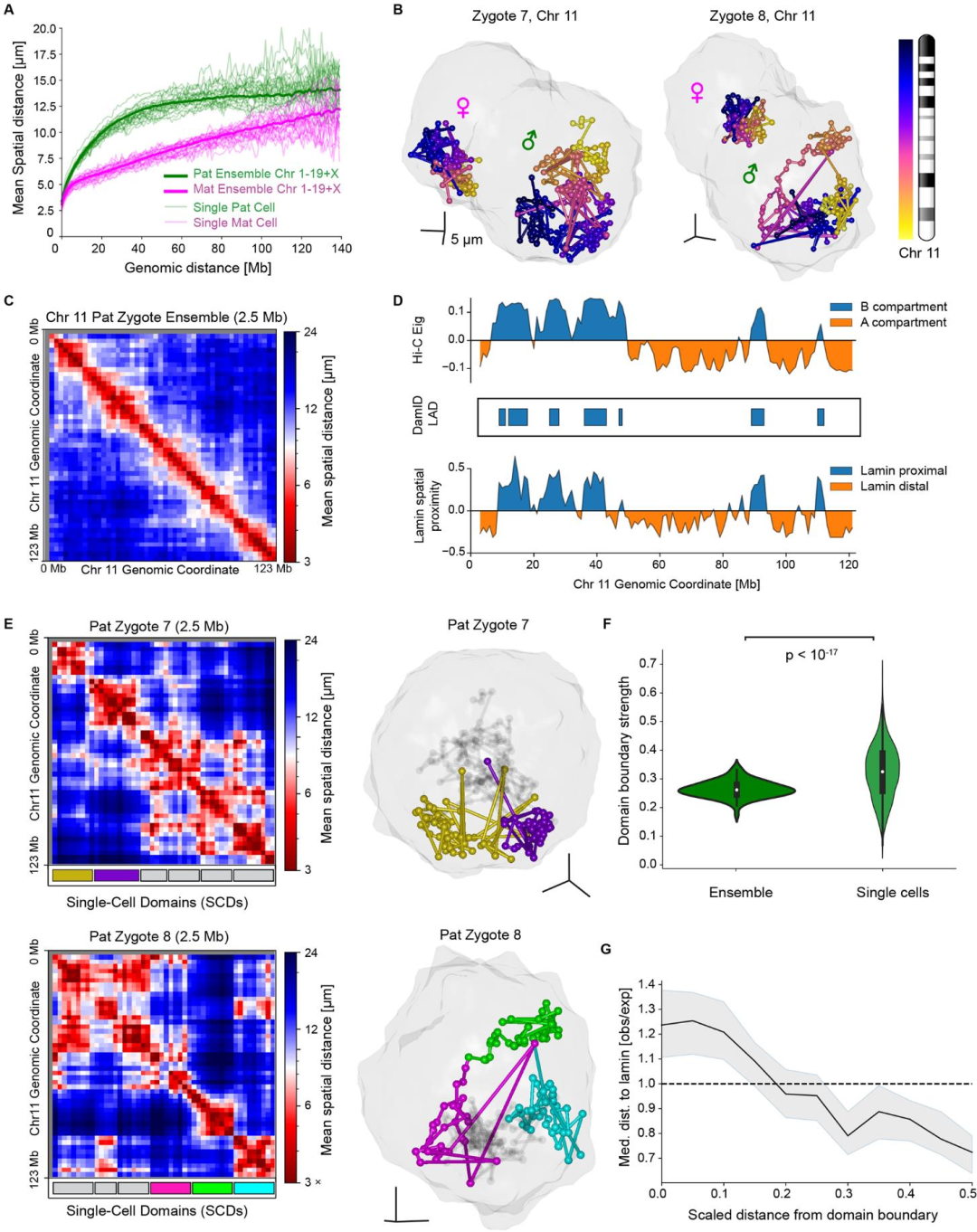 受精卵原核具有最高的基因组分辨率,其中染色质的大规模亲本特异性重组在ZGA中起着重要作用,因此,研究者使用IGS检测亚染色体的空间结构探究其作用。首先,研究者描述了受精卵亲本基因组中平均空间距离与基因组配对距离之间的比例关系,发现每个亲本基因组都有不同的缩放特性,并且父本受精卵染色质表现出异常弱的A/B区室化和异常大的片层相关结构域。然而,在检查单细胞距离矩阵时,研究者发现单个父本原核通常表现出大量空间上相关的染色质,称其为单细胞结构域(SCDs),鉴定出的SCDs与目测识别出的空间上不同的簇非常吻合,然后,研究者评估了单个细胞中所有SCDs边界的强度,发现它们明显比集成矩阵中用相同方法识别的边界更强,更多变。最后,研究者调查了SCDs与核标记的关系,发现其边界和内部分别明显多于预期的远端板层和近端板层。