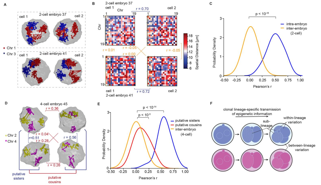 胚胎发育涉及通过单个胚胎内的克隆细胞谱系进行染色质组织结构和调节特征的表观遗传学传递。前人研究发现染色体区域在间期早期形成,随后保持其相对位置直到前期,因此比较染色体定位可以量化间期细胞之间全基因组组织上的相似性。研究者通过比较单个胚胎内和胚胎间成对细胞的单细胞常染色体距离矩阵来量化相似性,结果表明2-细胞胚胎中的细胞可能在受精卵中期共享它们共同的初始染色体定位记忆。接下来,研究者在每个4-细胞胚胎内构建了假定的克隆谱系树,对假定的姊妹细胞和表亲细胞进行分类,结果证明了在早期胚胎中染色体整体定位的克隆谱系特异性相似性,并暗示染色体定位的表观遗传记忆在第二次卵裂过程中从母体细胞传递到子体细胞,虽然其机制尚不完全清楚,但这种记忆可能反映了染色体在向中期板聚集和离开中期板过程中的最小相对重定位。这种整体染色体定位的有丝分裂遗传性可能会影响发育中生物体的生存能力和表型。