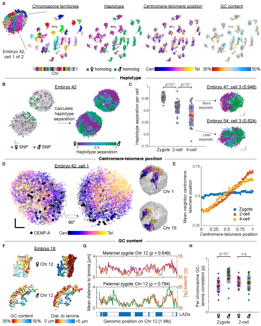 接下来,研究者聚焦于前述的全基因组组织原理,重点关注亲本单倍型、着丝粒-端粒位置及GC含量。研究者分析了每个读数的空间染色体间邻居并计算了单倍型空间分离得分,结果显示平均分离得分的标准差随着发育阶段的延长而增加,表明亲本基因组在胚胎内的混合程度是具有异质性的,逐渐混合是有丝分裂后全局染色体重新定位的结果。然后,研究者检查分析了基因组沿着染色体的着丝粒-端粒轴的整体空间结构,结果显示2-细胞和4-细胞阶段的着丝粒显著聚集在细胞核的一侧,并可观察到着丝粒-端粒评分高度极化,通过量化发育阶段的极化,发现2-细胞和4-细胞阶段的相关性比受精卵阶段强,但这两个阶段细胞胚胎中向Rabl样构型转变的功能后果尚不清楚。最后,研究者检查了GC含量在基因组结构中的作用,结果显示GC含量与Chr12跨核层的距离在父本和母本同源物中均存在相关性,且在受精卵中父本同源性显著高于母本同源性,但在2-细胞阶段不存在该现象,这表明GC区室化程度可能受原核的不同生物学历史的影响(图4)。以上结果表明IGS能够以亲本特异性分辨率和核标记来描述不同发育阶段的3D基因组组织。